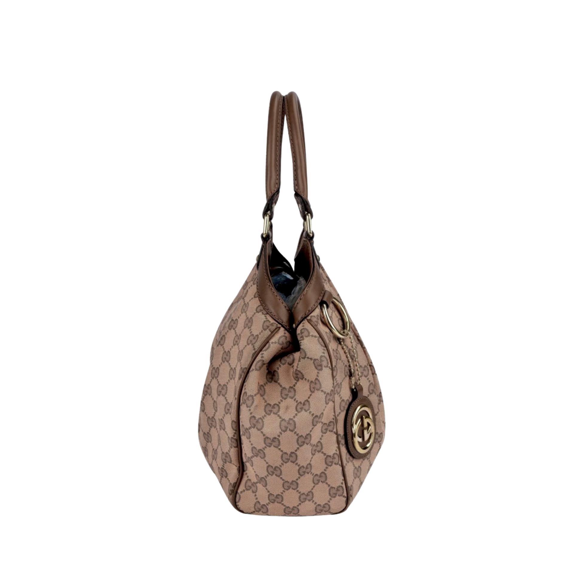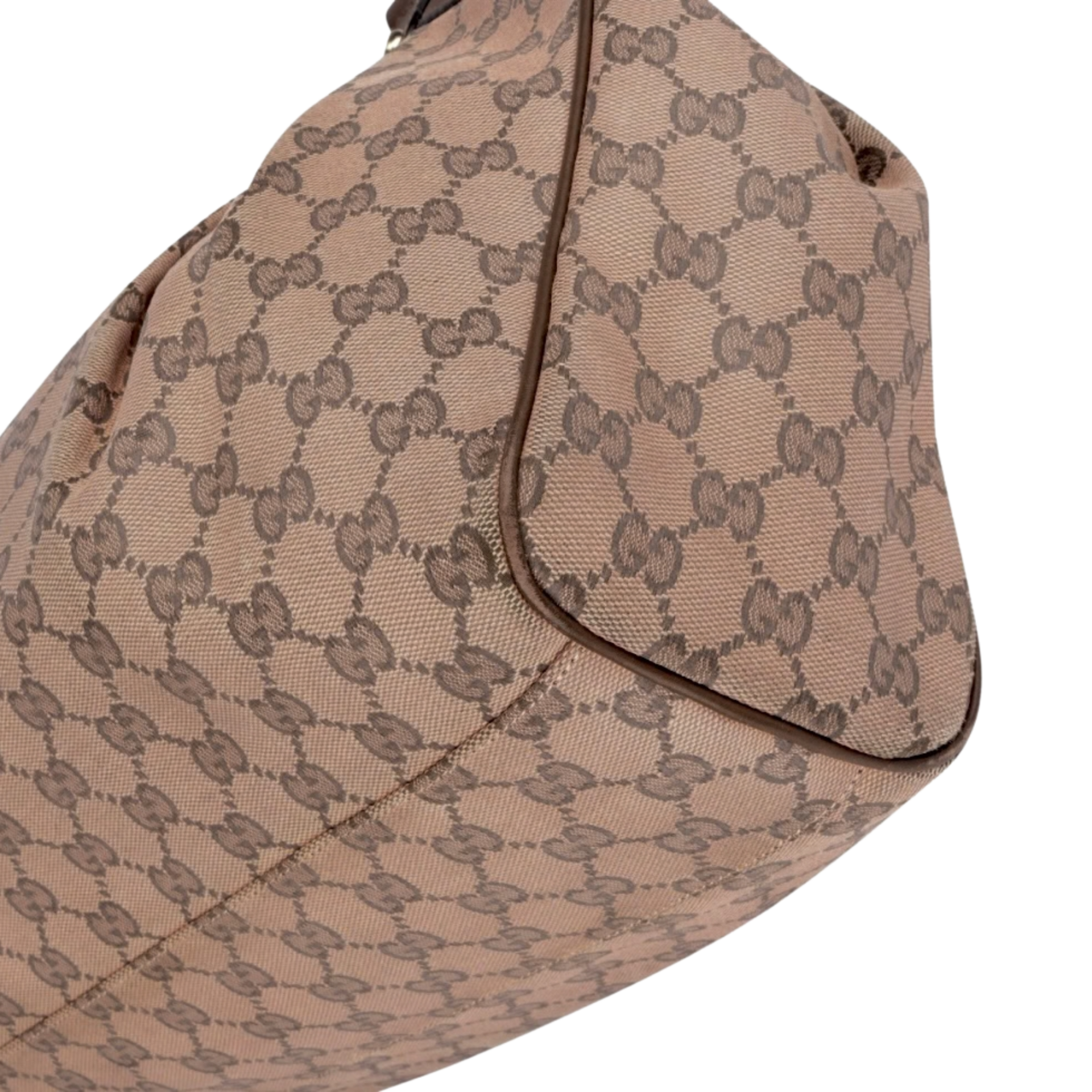 Pre-loved Gucci Sukey handbag crafted in Italy from signature GG monogram canvas in a soft light pink tone with smooth brown leather trim. This elegant and softly structured design features rounded top handles, gold-tone hardware, refined stitching details, and the iconic interlocking GG charm for a feminine finishing touch. The spacious interior offers ample room for daily essentials while maintaining a sophisticated and timeless silhouette. A chic statement piece that blends classic Gucci heritage with a modern, graceful look.