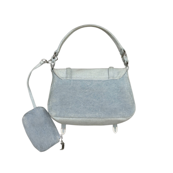 A true eye catching piece that brings character to any outfit. This bag deserves a spot in your collection. This stylish Juicy Couture bag is crafted from light blue denim and features silver hardware, including signature “Juicy” and “Couture” charms for that iconic early 2000s touch. The structured silhouette, buckle detailing, and matching detachable coin pouch make it both trendy and practical perfect to elevate any casual or streetwear-inspired look.