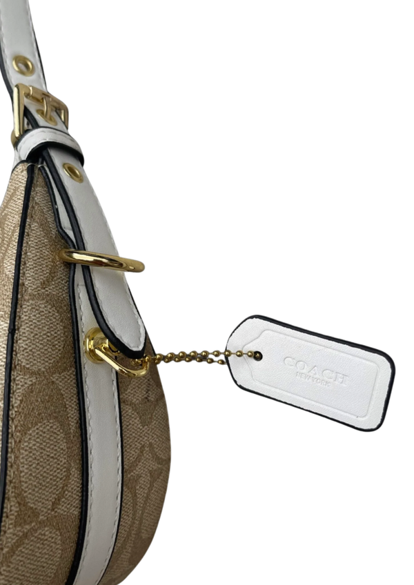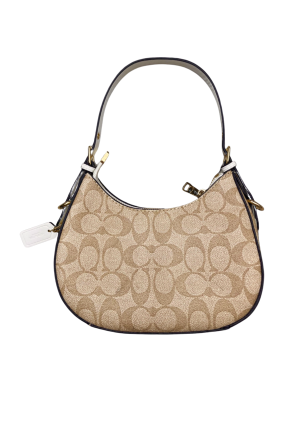 A sleek and versatile piece that adds a refined touch to any wardrobe. This Coach shoulder bag features the iconic signature monogram in beige with gold-tone hardware and subtle leather trim. Its compact silhouette and structured shape make it perfect for day to night wear, while the elegant branding and neutral tones make it easy to pair with any look.