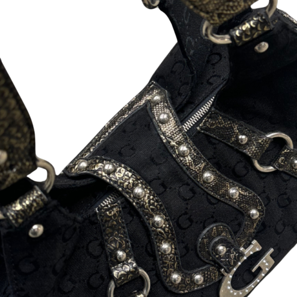 This unique Guess shoulder bag mixes classic and bold in one design. Crafted from black monogram fabric and finished with textured faux snakeskin panels, it’s a bag that stands out without trying too hard. Despite having multiple compartments and plenty of space inside, the bag still looks sleek and put-together never bulky or overstuffed. The structured silhouette, silver hardware, and signature “G” detail give it a confident edge ideal for daily wear or dressing up a simple outfit.