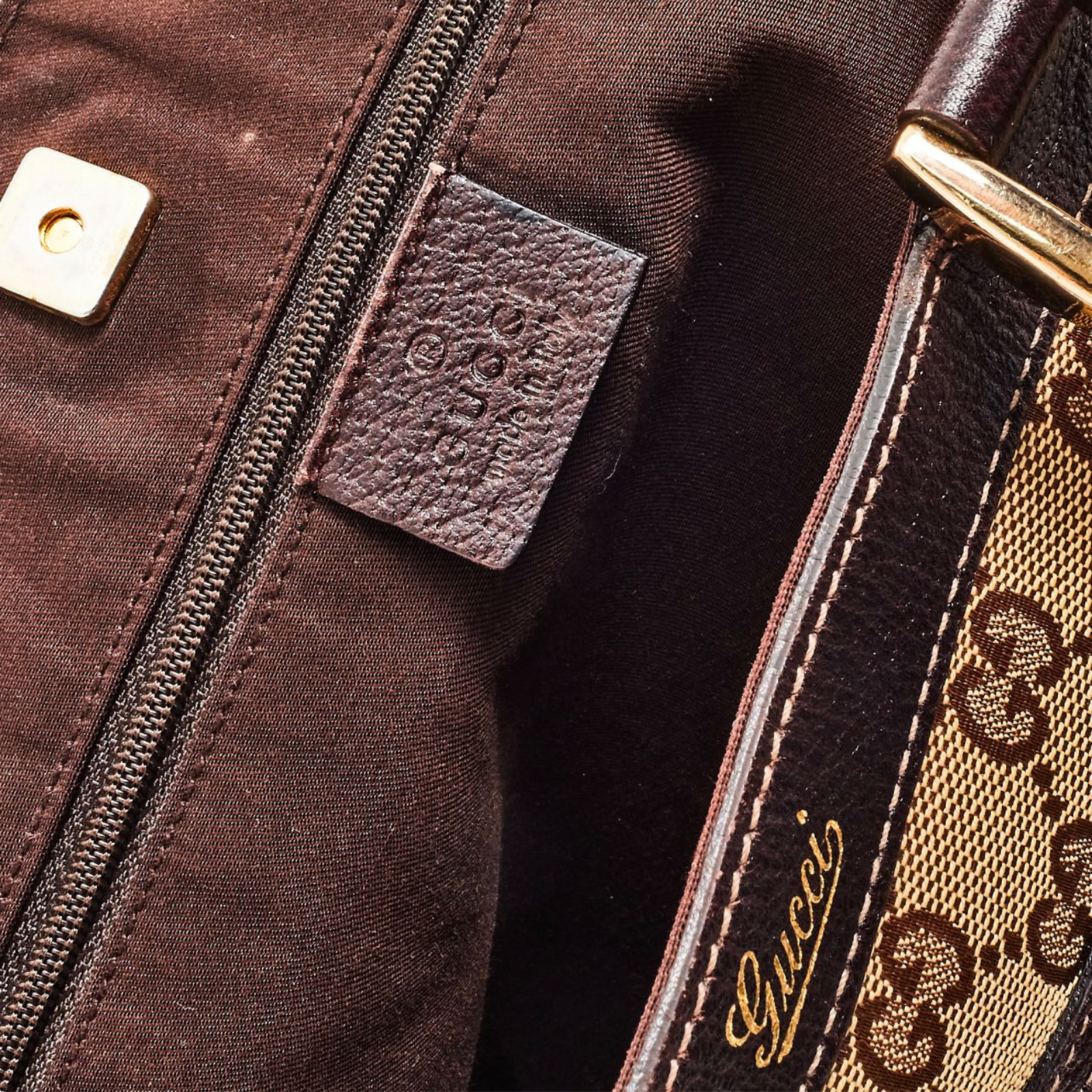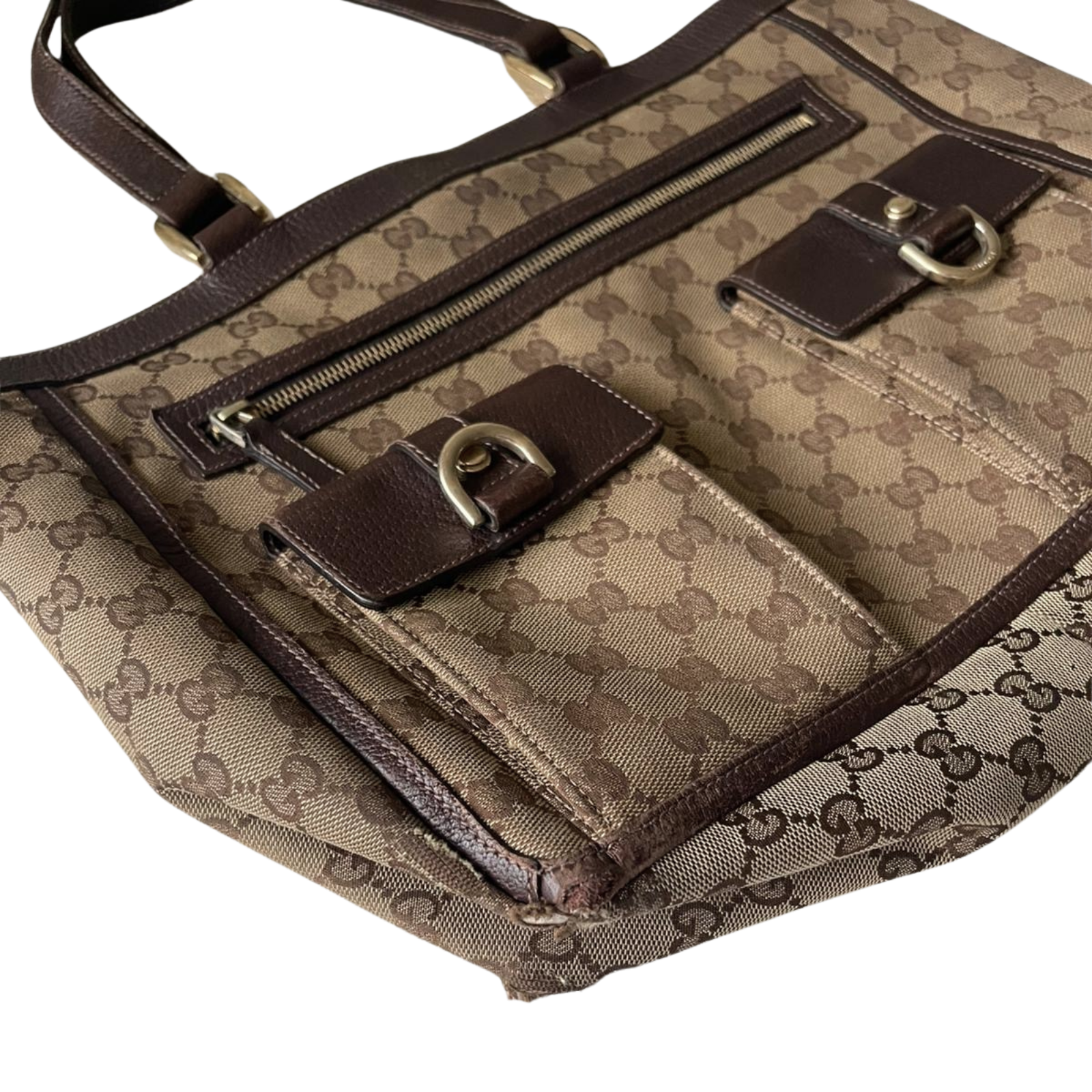 Pre-loved Gucci tote bag crafted in Italy from GG monogram canvas with leather trim. This spacious and elegant design features flat leather straps, an open top with magnetic closure, and front exterior zip and flap pockets for convenient storage. The interior includes both zip and slip pockets for organization. A timeless everyday bag that blends sophistication with functionality.